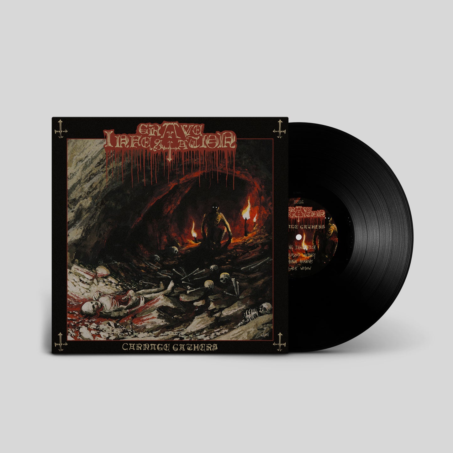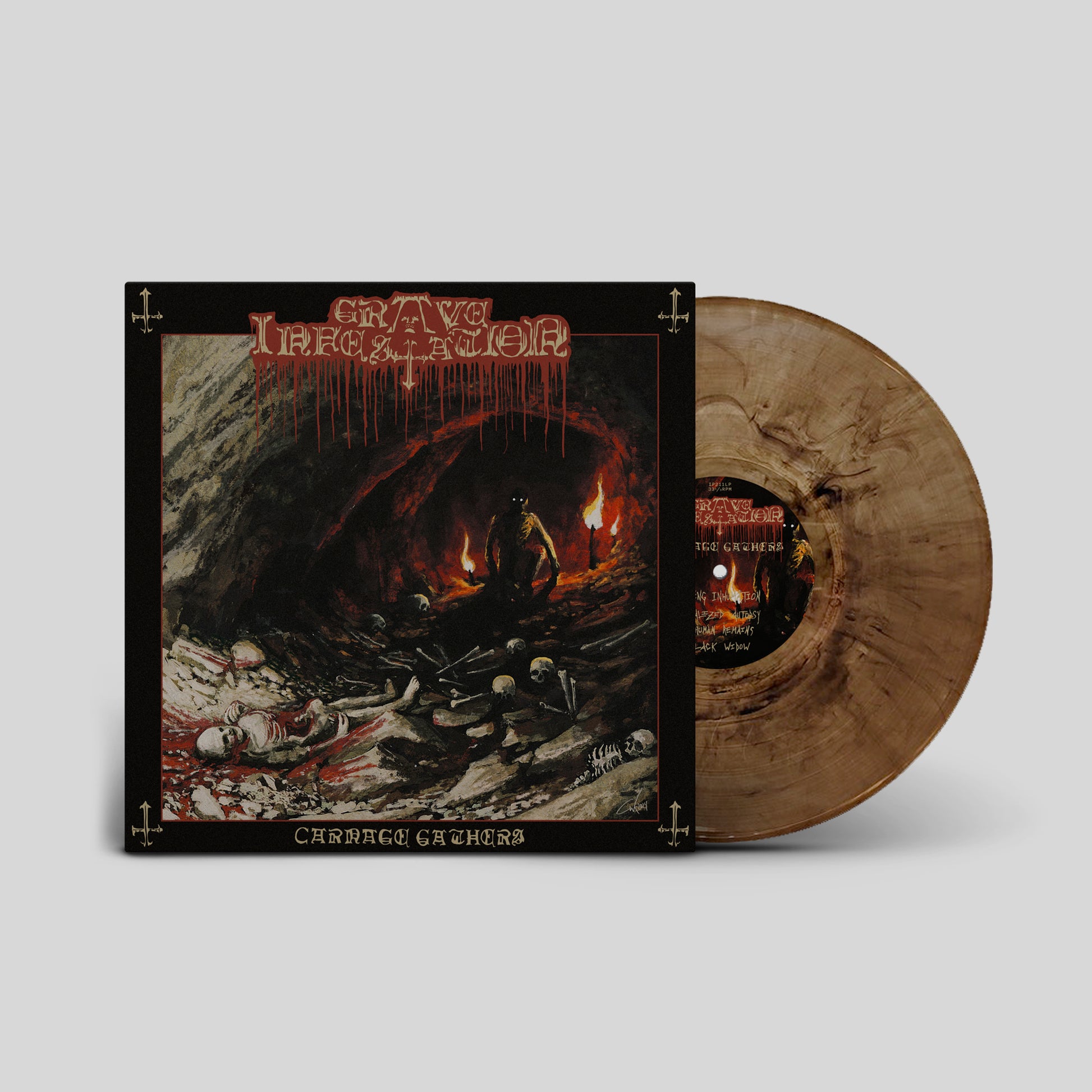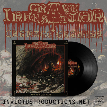 Nearly 3 years after the release of their debut full-length PERSECUTION OF THE LIVING, Grave Infestation return with their follow up CARNAGE GATHERS. Returning to work with Invictus Productions for this release and teaming up this time with Dark Descent Records, the album was recorded and mixed with engineer Greg Wilkinson at the infamous Earhammer Studios, producing a vile record that is a sonic push forward. Eight tracks and 40-minutes of violent, unrelenting death metal: the fast parts are faster, the slow parts are slower and everything is just plain nastier. Grave Infestation continues to pull influences from the likes of AUTOPSY, GRAVE, NIHILIST, REPULSION, and ABHORRENCE and mould them into a sound that is their own. Combined with Misanthropic Art Illustration’s ominous artwork, this release will be sure to stay glued to your turntable.
