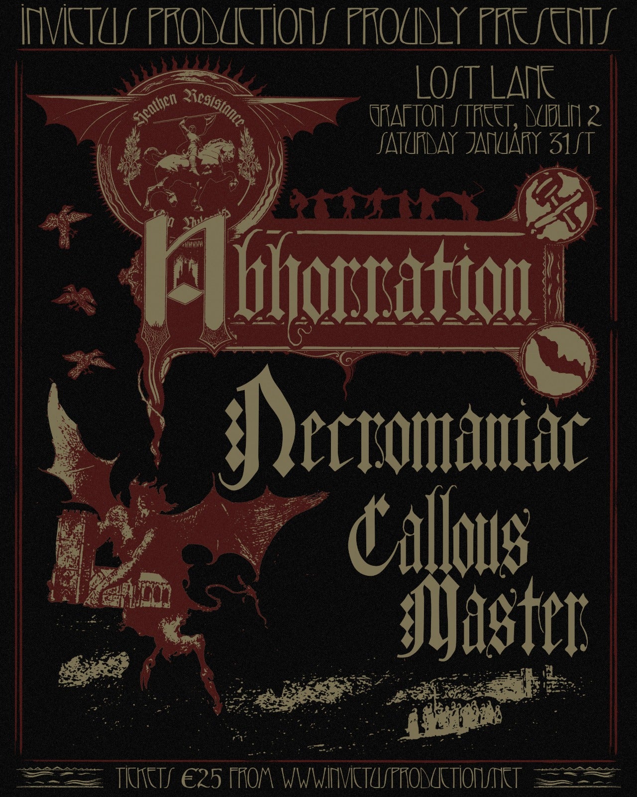 ABHORRATION + NECROMANIAC + CALLOUS MASTER Saturday January 31st 2026