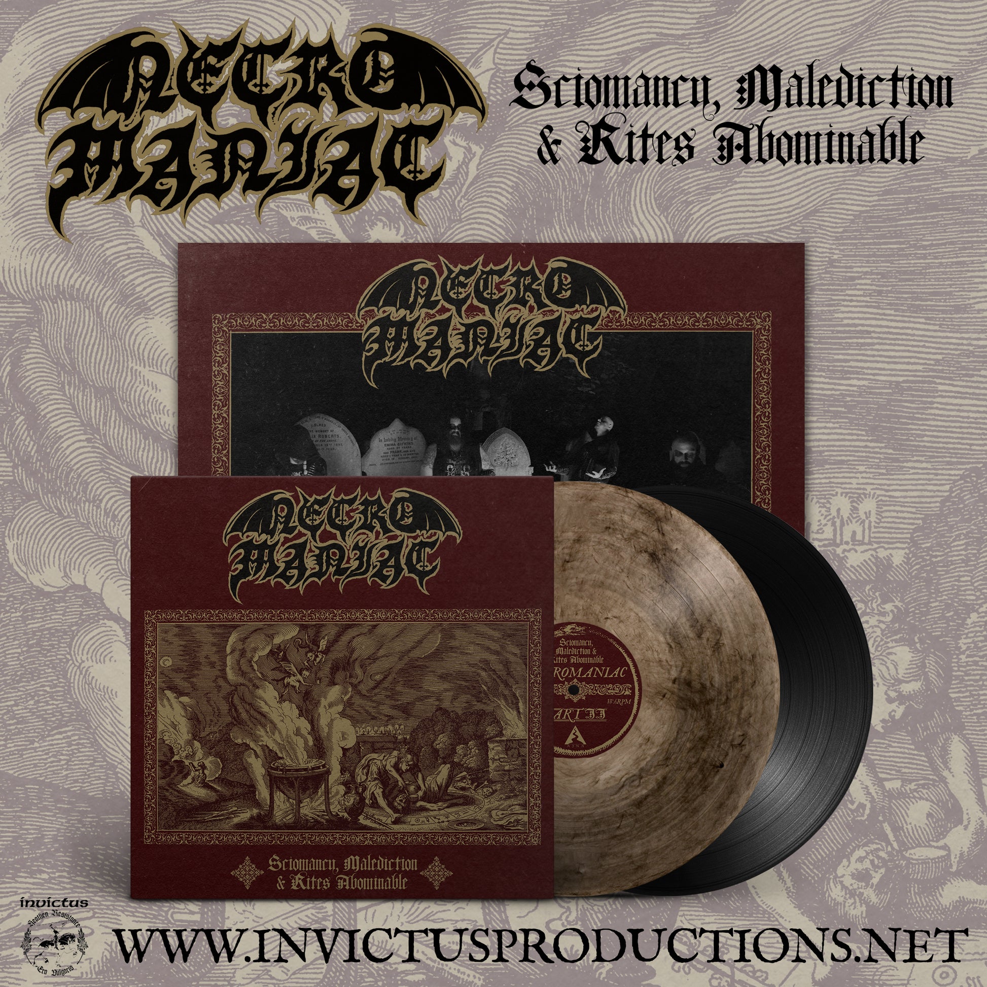 INVICTUS PRODUCTIONS in conspiracy with THE AJNA OFFENSIVE are proud to present NECROMANIAC's long-awaited debut album "Sciomancy, Malediction & Rites Abominable" on DIGITAL, CD & LP formats. INVICTUS will handle the album's release for Europe while AJNA will handle its North American release. The CD & DIGITAL versions are scheduled for release on January 13th 2025 to coincide with the Wolf Moon, while the LP version will most likely be unleashed at a later date.