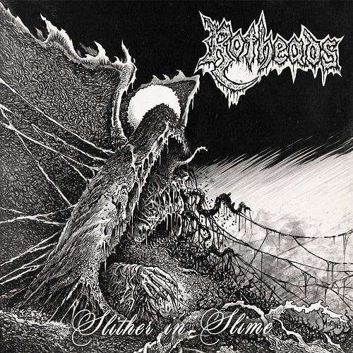 The long-awaited 2nd full-length by this Romanian band. This putrid ensemble was formed in Bucharest back in 2014 as an old-school Death Metal side-project to the experimental doom/noise/stoner-improv band Keeng Ra'at: both bands contained the same three members. By 2015, five songs were written, and recordings began in December of that year. Ultimately, six songs (plus intro and outro) came out in April 2016 as the "Unfazed by Death" demo, which turned out to be a remarkable, sick trip into the bowels of murky and foul-smelling Death Metal. In the meantime, another guitarist joined the band, and the original bassist left and rejoined later on. The original drummer and vocalist also left the band in August of that year, and another drummer then joined, while the vocals have been henceforth handled by the original guitarist. With that lineup thus set, Rotheads burst from the bowels of the ugliest underground with their aptly-fucking-titled debut album, "Sewer Fiends", for Memento Mori in 2018. Unyielding and unapologetic, Rotheads took their aggregate influences -particularly from the classic early 90's Finnish scene (Convulse, Abhorrence/Amorphis, Sentenced, Demigod, Depravity), as well as other timeless crypt dwellers such as Autopsy, Gorement, Edge of Sanity, Accidental Suicide, Incubator and Asphyx- and proceeded to create a mesmerizingly murky 'n' moody work with their debut album. The sewage was piled high and plentifully, and true diehards took notice. And still the sewers call! A four-way split with Vorus, Engrossed and Eruptive followed a year later, but the sewers of the soul that pollute Rotheads continued to pulse, patiently lying in wait for the right time to strike. And strike they do with their sophomore full-length, "Slither in Slime"! Another aptly-fucking-titled album, "Slither in Slime" immediately sounds like Rotheads, but something strange -something altogether unwholesome and even otherworldly- is at work here. While no doubt as crushing as ever, there's a cool/calm/collected execution to the album that creates tension and unease, allowing those same foul 'n' fetid riffs to wash over you with filthier effect, and something approaching "atmosphere" results. Patient? Yes, but the payoff is even grander, as a swirling creepiness seduces even the most closeminded death metaller. We could also say that "Slither in Slime" is catchy as fuck, but that should be apparent to anyone who dares to step into Rotheads' newest sewer. Simply massive? You fucking bet! Graced with appropriately stark cover art courtesy of Mörtuus, and suitably tendrilous mastering courtesy of Ted Tringo, Rotheads have eclipsed the lofty standards set by their debut: you are hereby commanded to Slither in Slime!